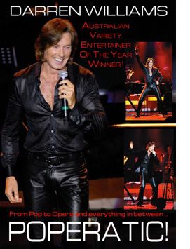 From Pop to Opera, Broadway to Vegas, Disco to Divas, POPERATIC is Darren Williams’ Multi MO and ACE Award winning show. Highlighting Darren’s amazing 5 OCTAVE VOCAL RANGE, this show features his most requested songs and inspires any audience to a standing ovation. According to budget and venue, Darren can customize his award winning POPERATIC show to suit just about any occasion and demographic.